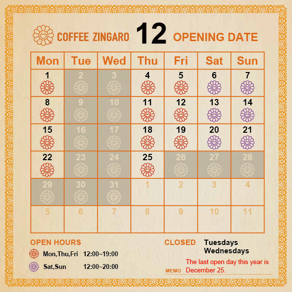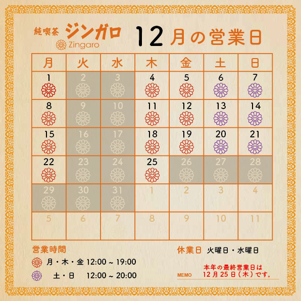 純喫茶ジンガロの12月営業日のご案内です。
