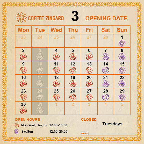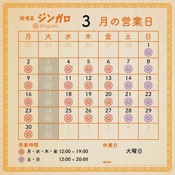 純喫茶ジンガロの3月営業日のご案内です。
